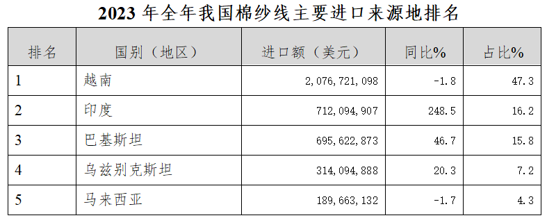 From the perspective of import sources, the top five sources of imported cotton yarn are all from Asia, and the top five sources together account for 90%. Imports from South Asia and the two countries increased, while the rest declined to varying degrees. Vietnam has always been the first source of cotton yarn imports in China. In 2023, 865,000 tons of cotton yarn were imported from Vietnam, a year-on-year increase of 19.1%, accounting for 42.3% of the total cotton yarn imports, and the import value reached 2.36 billion, a year-on-year increase of 1.6%, accounting for 42.3% of the total imports. 39.5% of the total, accounting for a decrease. Among the top three cotton yarn import markets, my country’s cotton yarn imports from Pakistan increased by 46.7%, and my country’s cotton yarn imports from India increased significantly, with an increase of 248.5%.